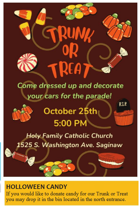 Starting the weekend of October 18 & 19 there will be a bin in the north entrance to donate candy and prizes (such as saint/holy stickers, holy cards, small saint/holy toys, etc.) for prizes for the games for the children. Please donate by October 30 as that is the date of the party.